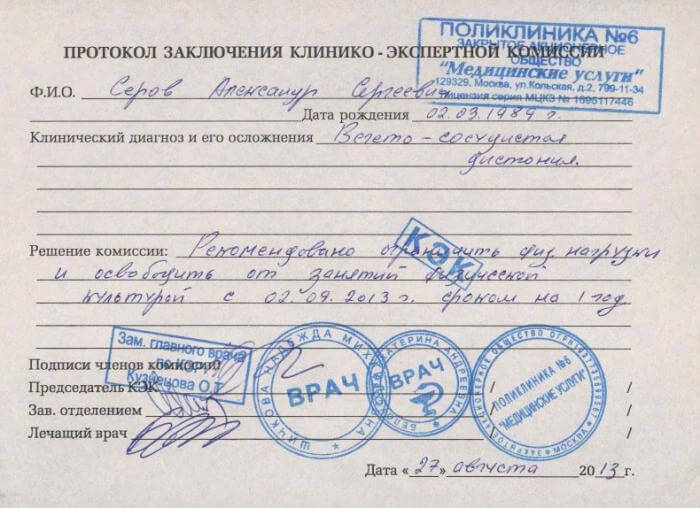 Понятно, что документ нужен там, где проводят занятия по физической культуре. Урок входит в обязательную программу школ, университетов и колледжей. Поэтому, предлагаем оформить справку срочно, без посещения врача в нашем медицинском центре. После получения вы сможете официально не ходить на уроки и потратить время на изучение важных предметов. Для этого врач оформляет документ, что существуют противопоказания для тренировок.